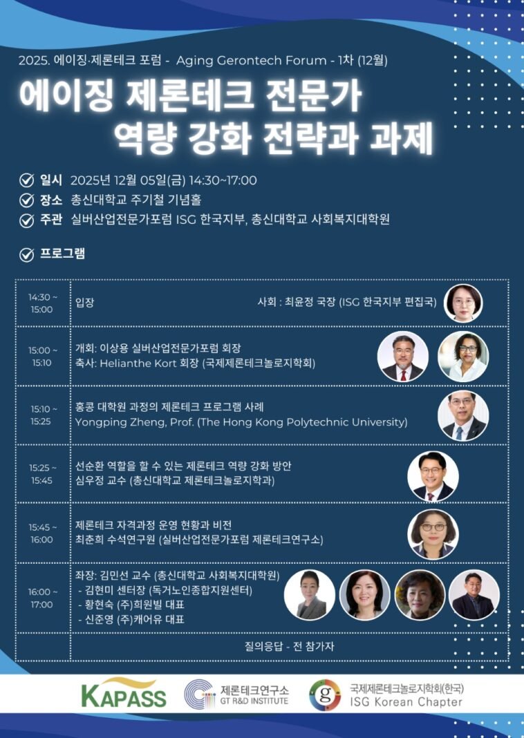 ‘2025 에이징·제론테크 포럼(1차)’이 오는 12월 5일 오후 2시 30분, 총신대학교 주기철 기념홀에서 개최된다. 이번 포럼은 국제제론테크놀로지학회(ISG) 한국지부와 총신대학교 사회복지대학원이 공동으로 주최하며, 초고령사회 핵심 분야인 제론테크놀로지(Gerontechnology) 인재 양성 로드맵을 공개하는 자리다.