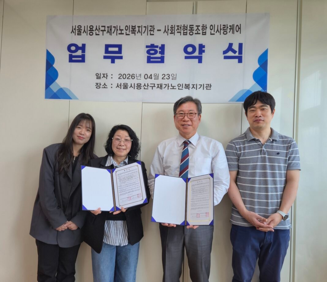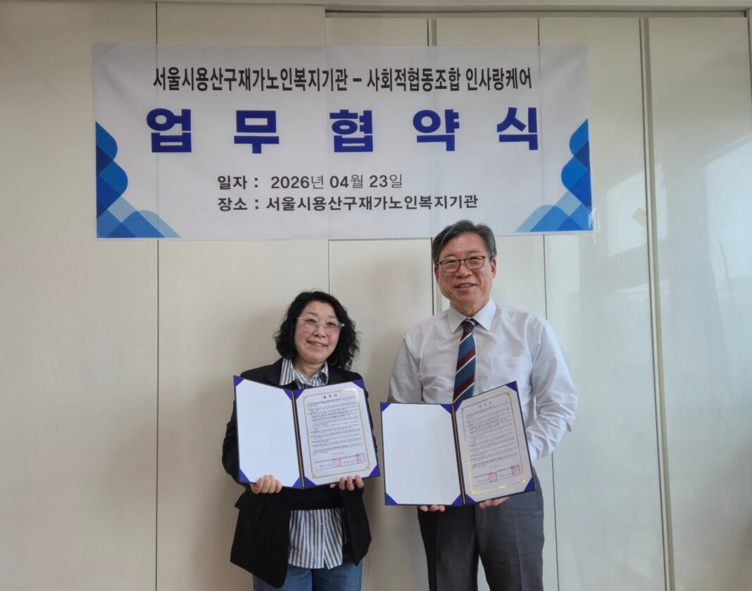 서울시용산구재가노인복지기관과 사회적협동조합 인사랑케어는 지난 4월 23일 업무협약식을 갖고, 용산구 내 퇴원 어르신과 재가 어르신을 위한 돌봄서비스 연계·협력 체계를 구축하기로 했다. 이번 협약은 서울시용산구재가노인복지기관이 용산구 퇴원환자 단기집중 서비스 거점 수행기관으로 지정된 것을 계기로 추진됐다. 양 기관은 지역사회 어르신들이 병원 퇴원 후에도 가정에서 안정적으로 생활할 수 있도록 돌봄 인력과 재가서비스를 유기적으로 연계해 나갈 계획이다.