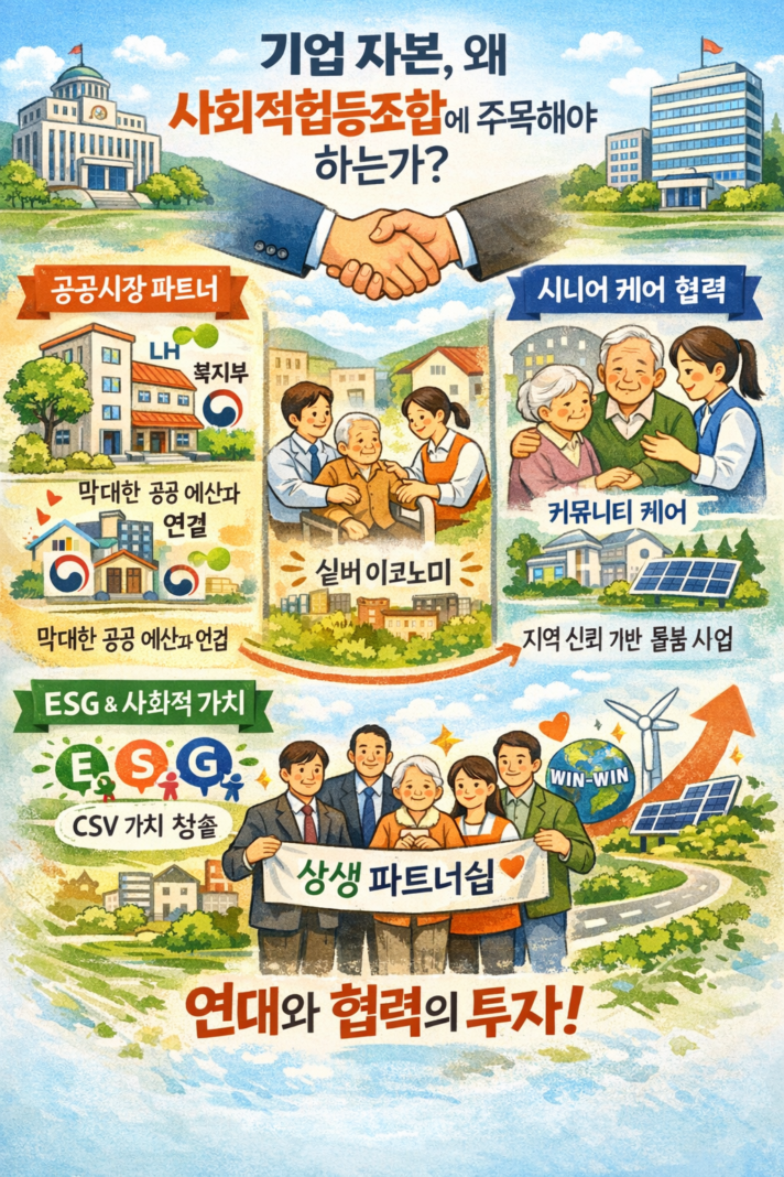 첫째, 사회연대경제는 정부가 보장하는 거대한 공공시장의 가장 확실한 파트너다. 이번 국무회의를 보면 기획재정부는 공공조달 시 협동조합 등 사회적 경제기업 제품의 의무구매 비율을 높이기로 했다. 또한 국토교통부는 LH와 협력해 ‘사회주택’을 확산하고, 보건복지부는 노인돌봄 공백을 ‘사회적협동조합’으로 메우겠다고 발표했다. 이는 곧 주거와 돌봄, 공공서비스 영역에서 막대한 예산이 사회연대경제로 흐른다는 뜻이다. 기업 입장에서 이 시장은 놓칠 수 없는 기회다. 민간의 효율적인 자본과 시스템이 협동조합의 공공성과 결합할 때, 기업은 안정적인 공공시장 진입로를 확보할 수 있다.